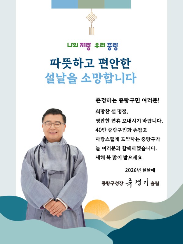 즐거운 설 명절 연휴를 맞아 가정에 웃음과 행복이 가득하시길 소망합니다. 중랑구는 안전하고 편안한 설 명절을 위해 최선을 다하겠습니다.